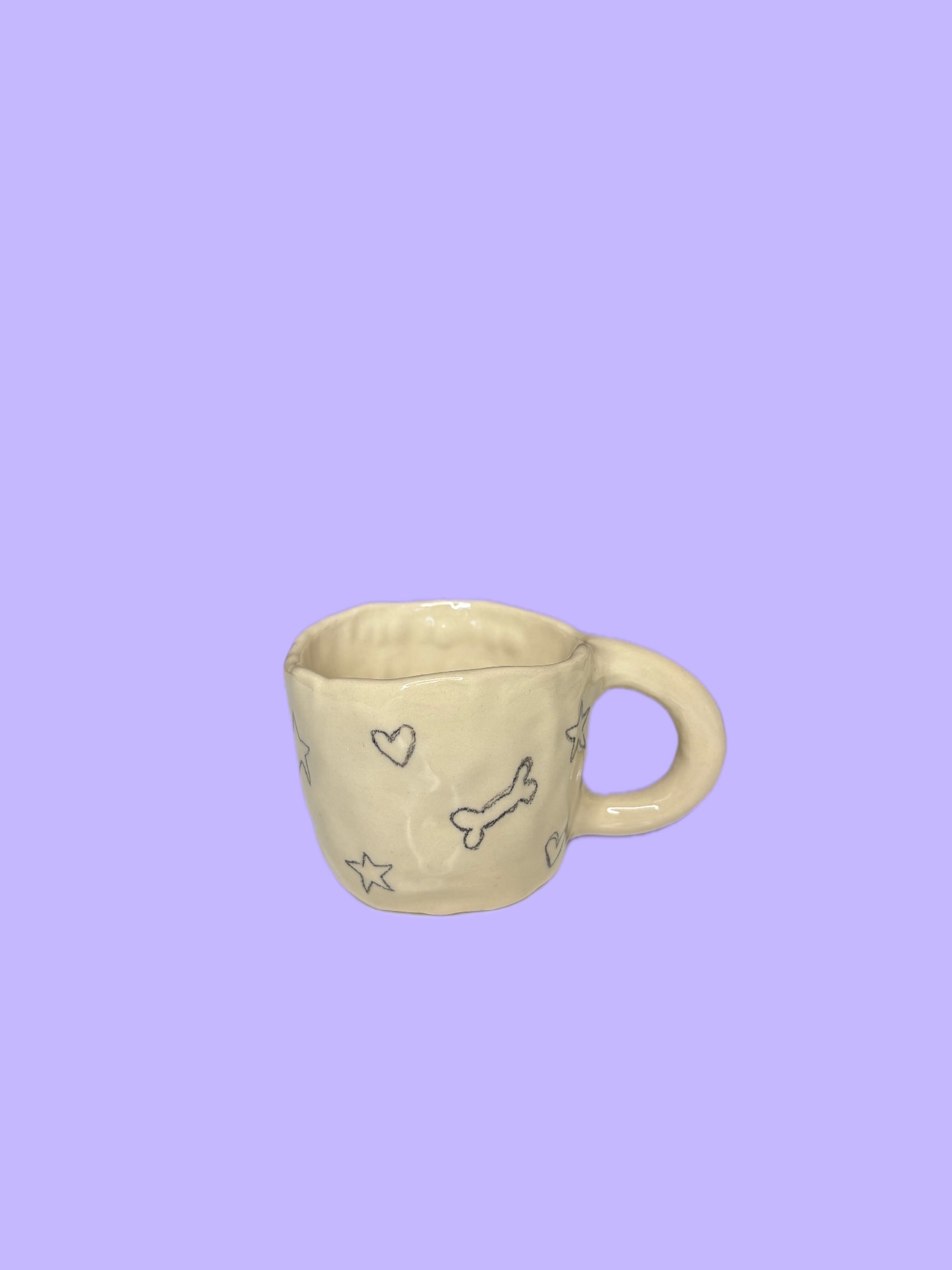 Håndbygget liten keramikk kopp med tegnet detaljer.