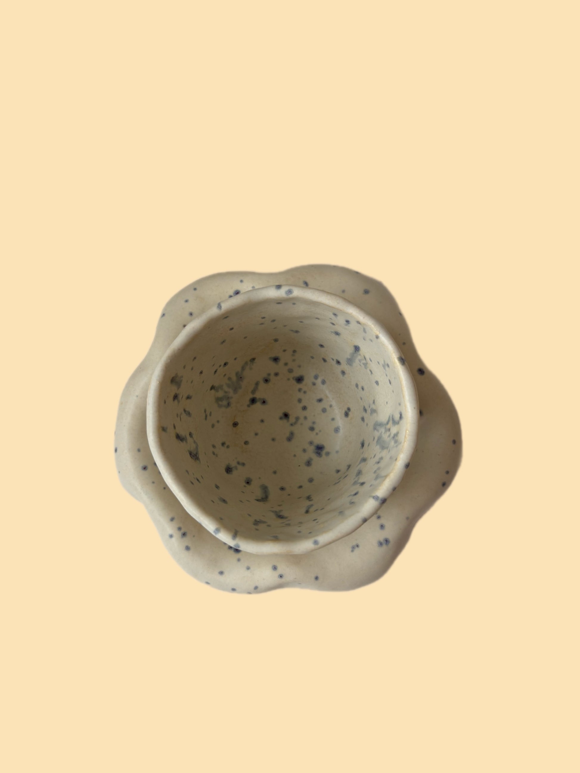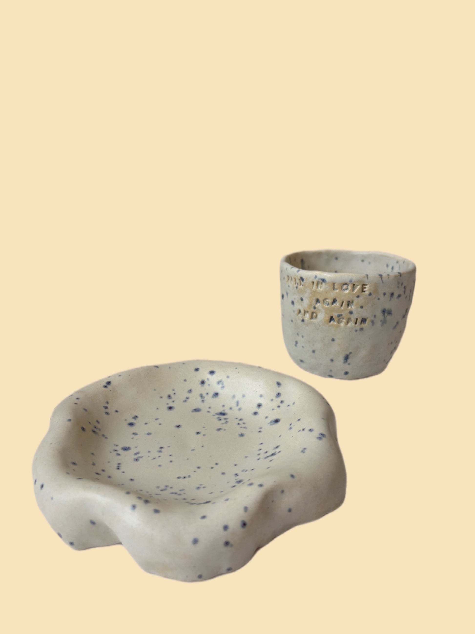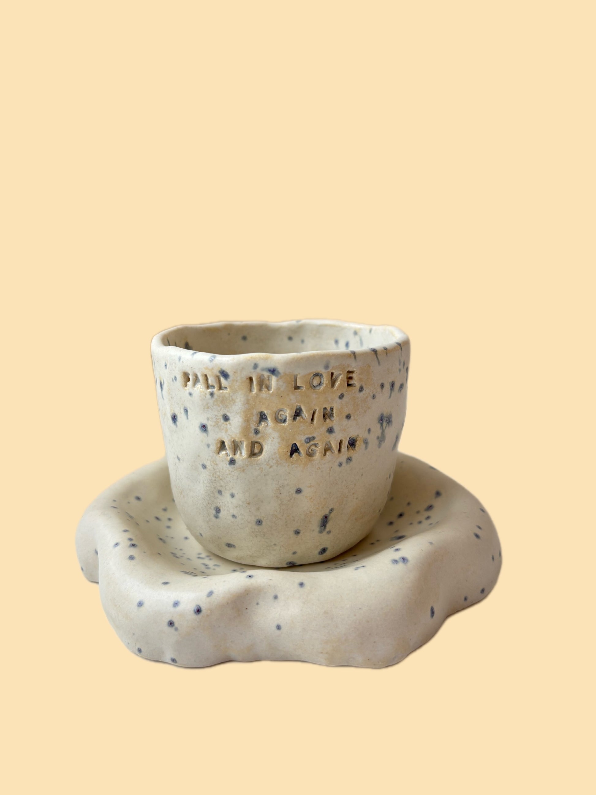 Sett med kopp og tallerken. Håndbygget med teksten «Fall in love again and again».