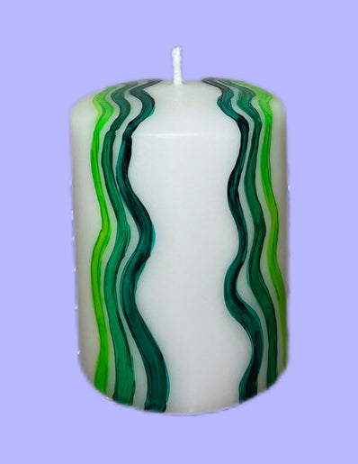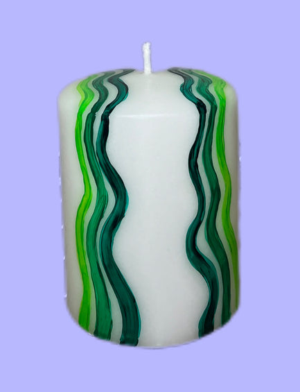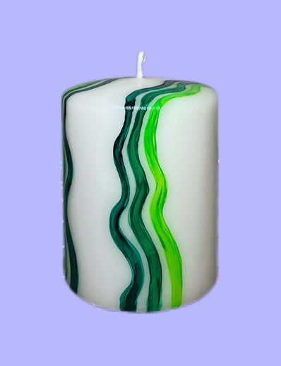These are hand-painted candles in various designs. Each candle is carefully crafted with unique patterns and vibrant colors, making them one-of-a-kind pieces.