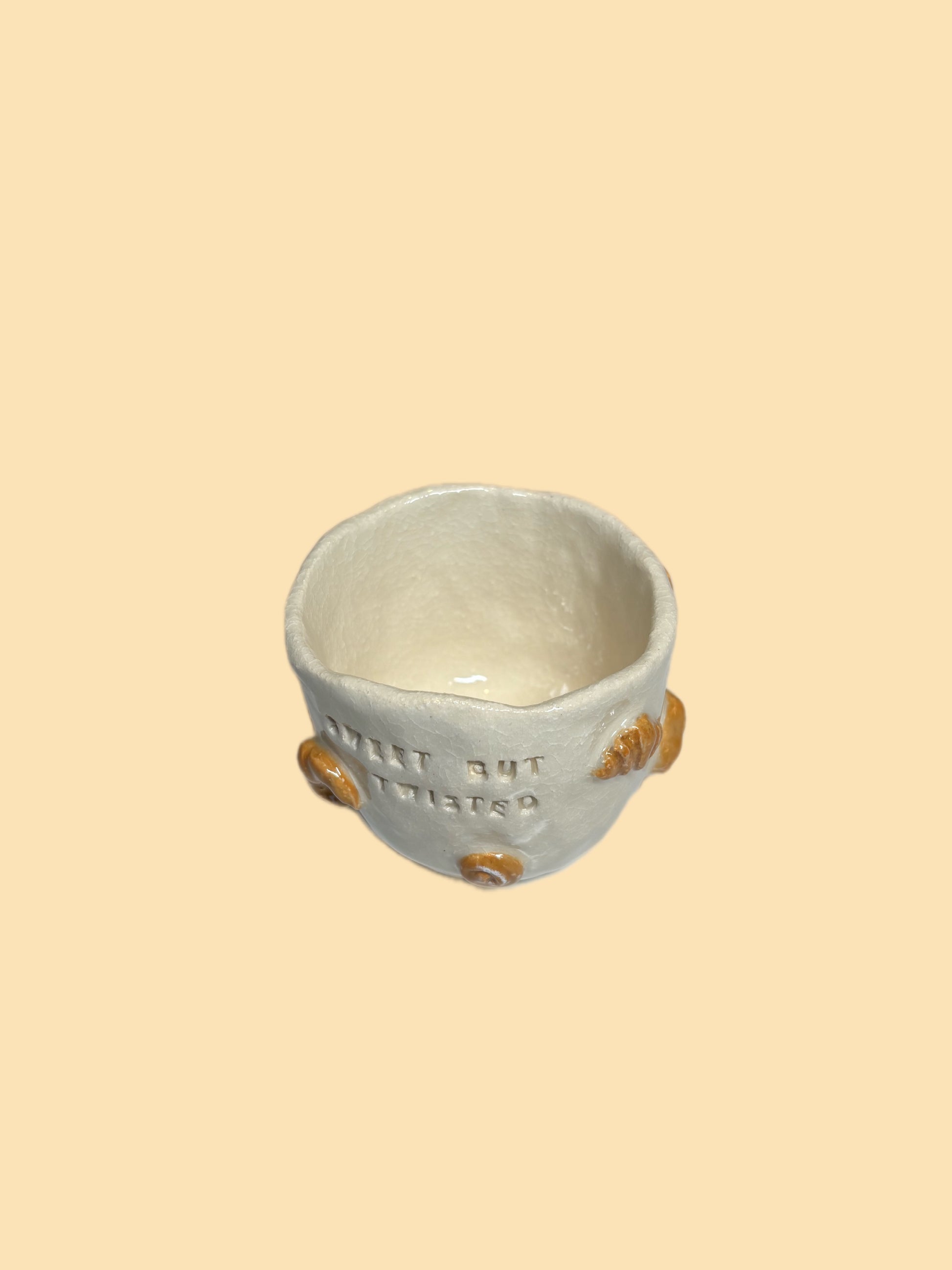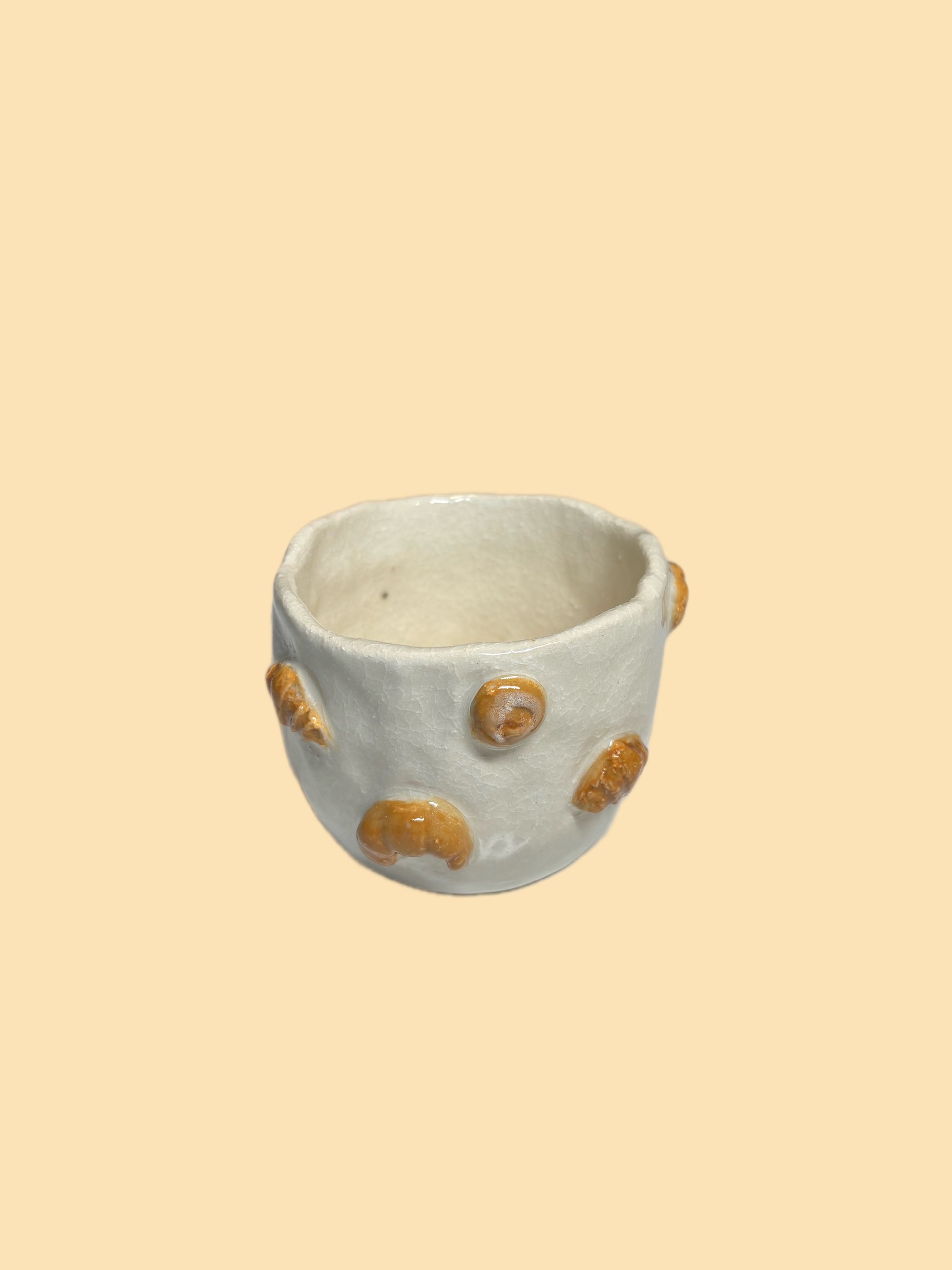 Håndbygget keramikk kopp med croissant og kanelboller.